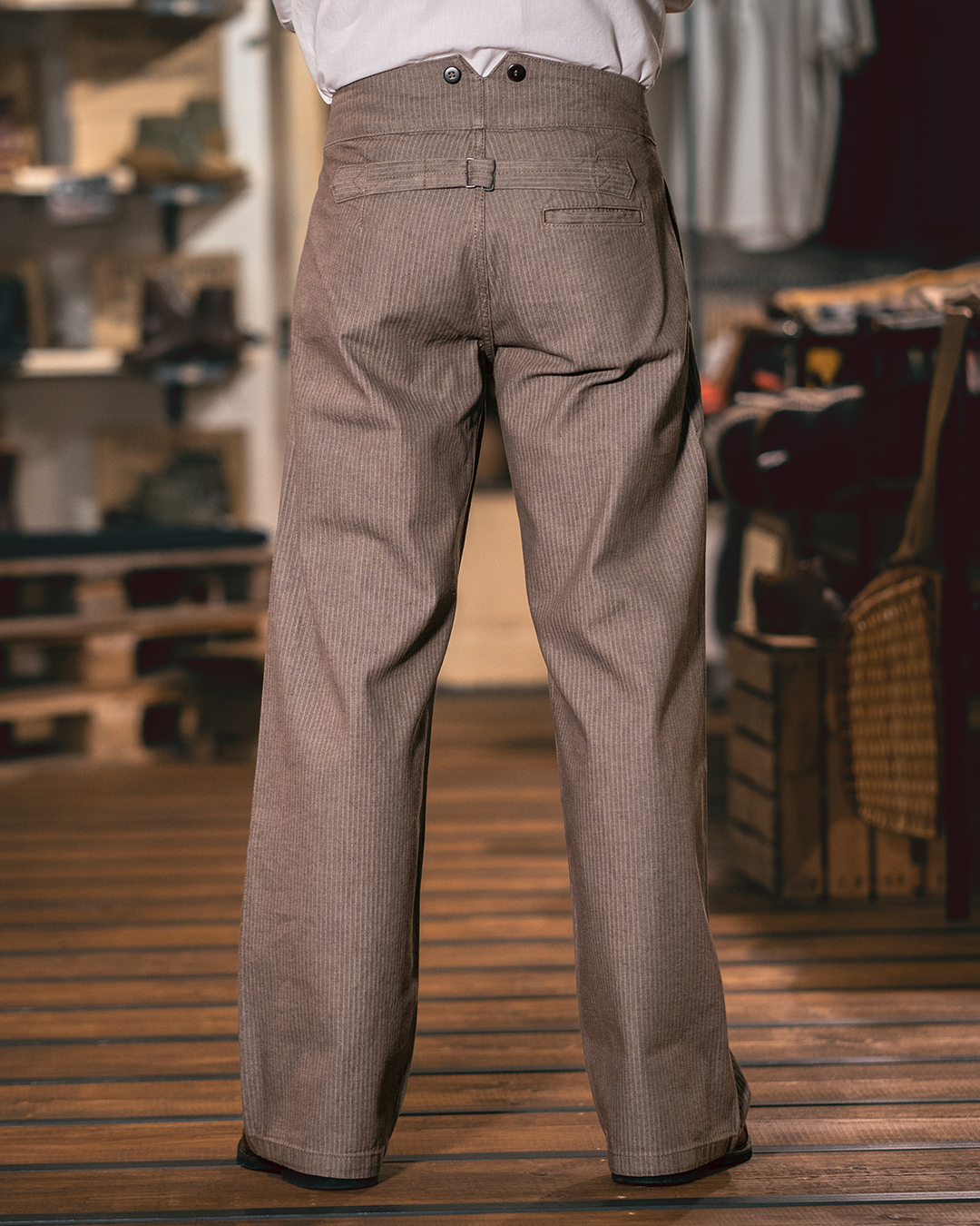 Schleppen, ziehen, zerren, hiefen. Alles Wörter die den Ursprung unserer 1905 Hauler Pant bezeichnen. Die Hose hat ihren historischen Ursprung im Arbeitsbereich des 19.Jahrhunderts. Wir haben diese Hose an Hand einer alten Fotografie um 1890 rekonstruiert. Die Fotografie wurde in einer alten Brauerei aufgenommen und zeigt einen Lagerarbeiter der an einem Bierfass lehnte. Leute im Handwerk oder aber in Brauerein mussten oft schwer heben oder „schleppen“ und die Arbeitsbekleidung musste daher bestimmte Kriterien erfüllen. Zum einen durfte sie nicht in der Bewegung einengen und zum anderen musste sie strapazierfähig genug sein um dem rauhen Arbeitsalltag stand zu halten.