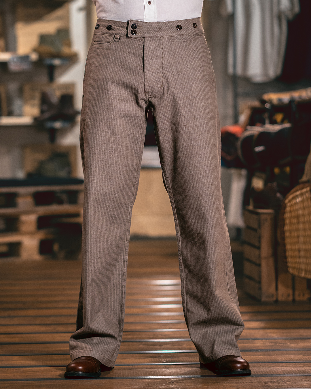 All das spiegelt sich in unserer 1905 Hauler Pant wieder. Der Schnitt ist sehr weit und der Bund sehr hoch. Also ist dadurch eine optimale Bewegungsfreiheit möglich. Sie hat Knöpfe um Hosenträger daran zu befestigen. Damals wie heute eine gute Möglichkeit damit die Hose nicht vom Leib rutscht.