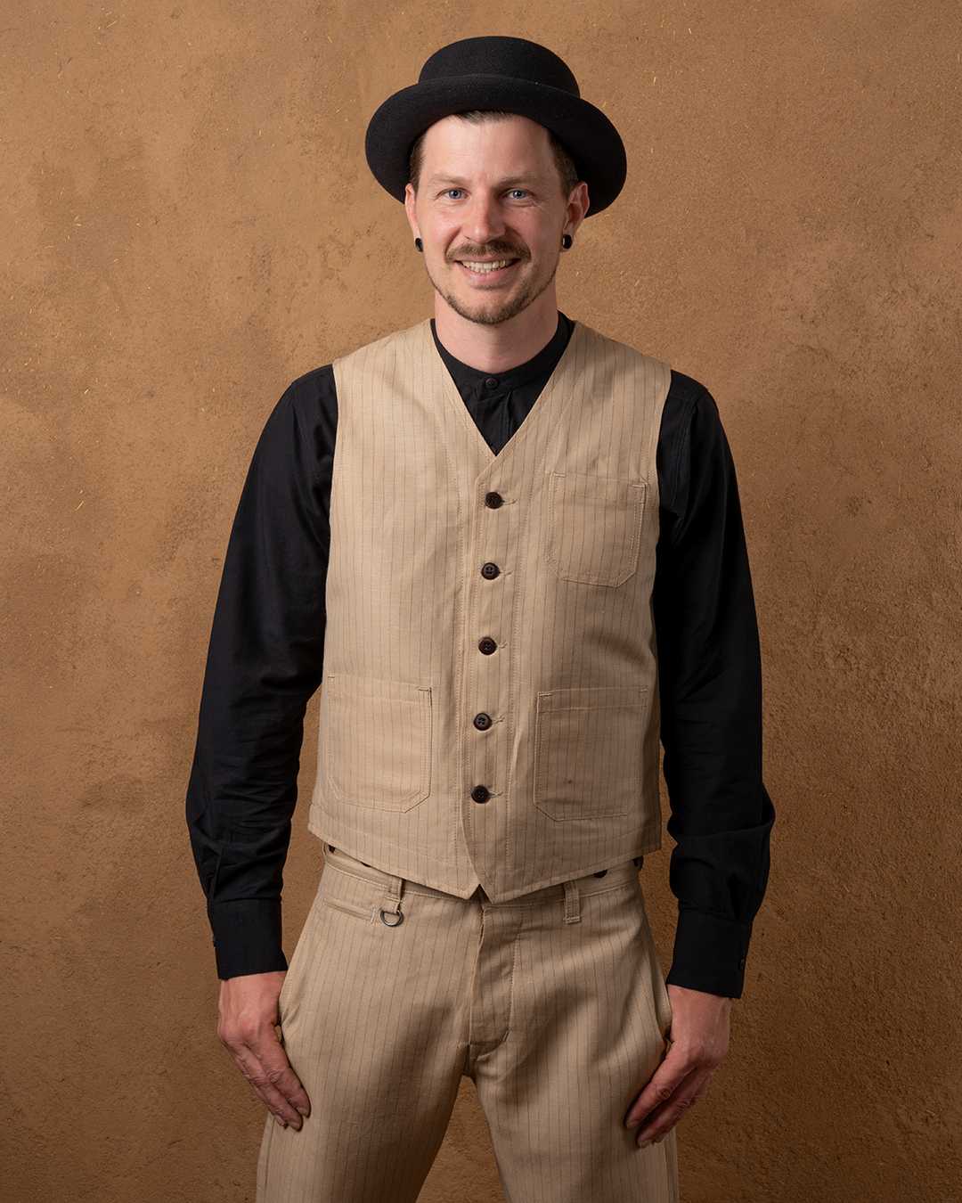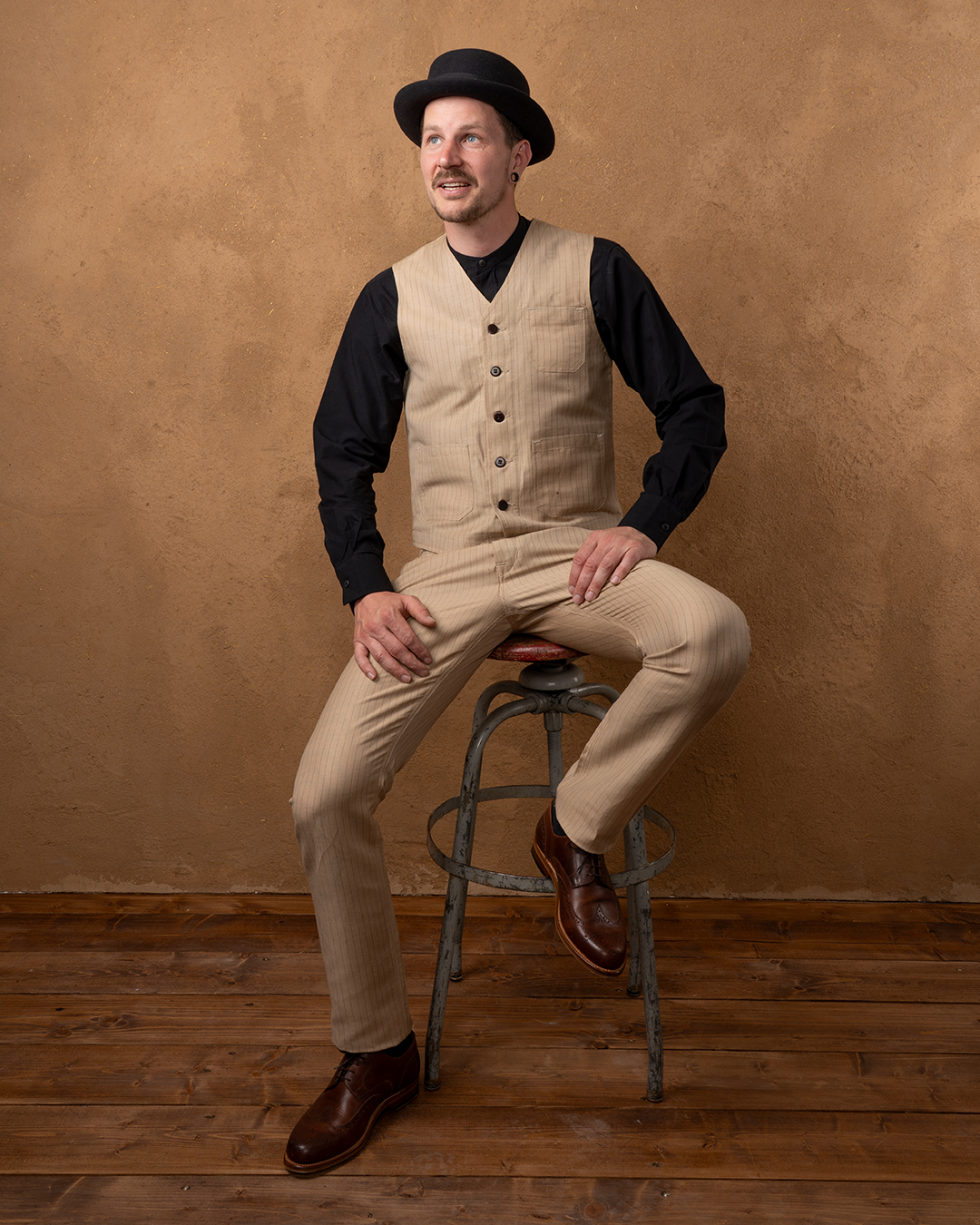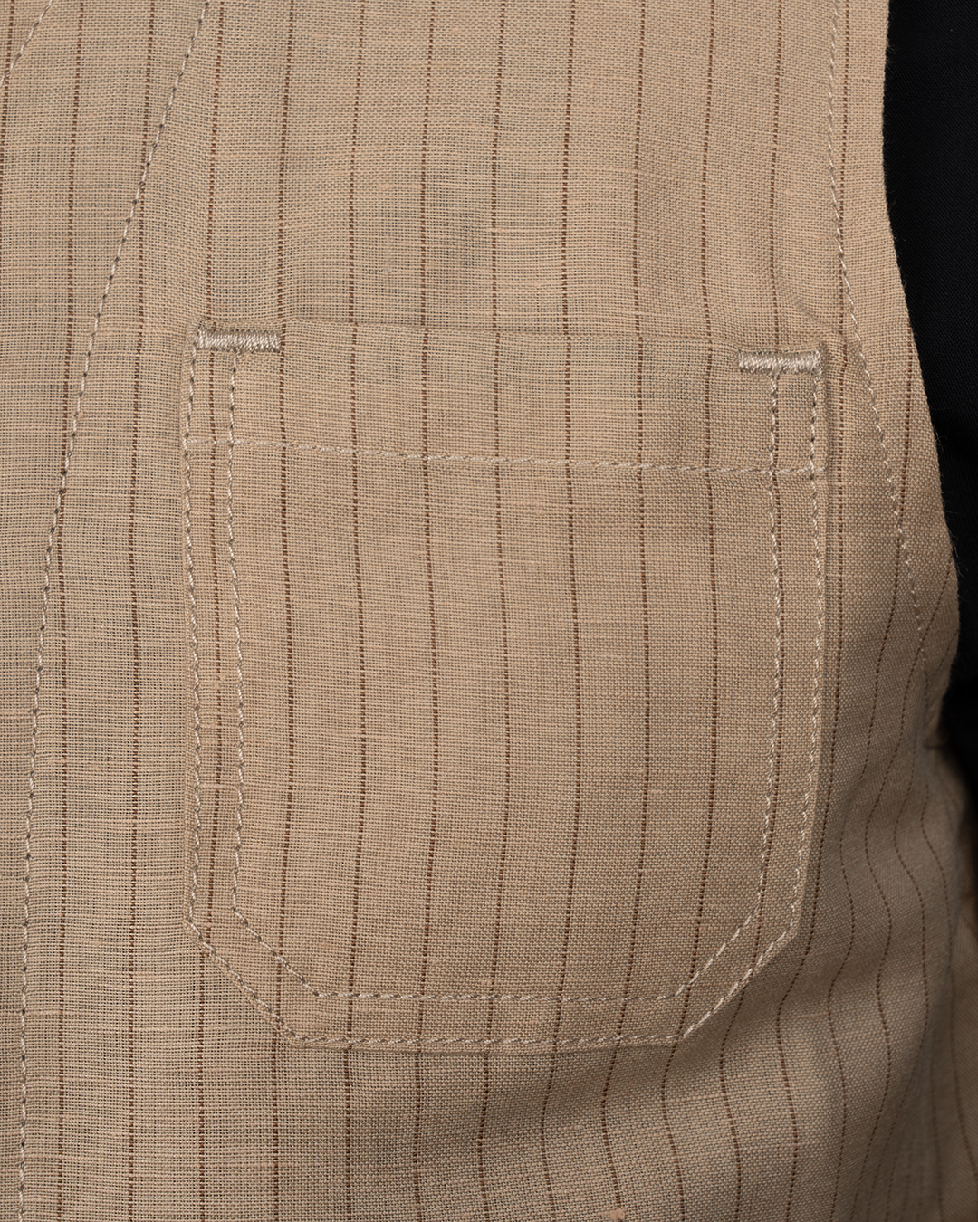 Unsere 1937 Roamer Vest in einer leichten Sommervariante. Der Stoff besteht aus 45% Wolle und 55% Leinen und wird exklusiv für uns in Portugal gewebt. Er ist angenehm zu tragen und bietet eine elegante Optik.