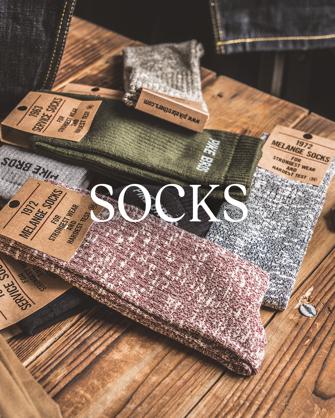 "Unsere Socken gibt es in vier verschiedenen Ausführungen: Die 1963 Utility Socks sind dicke Stiefelsocken mit gepolsterter Sohle – ideal für kaltes Wetter. Die 1965 Summer Socks sind leichte Stiefelsocken mit gepolsterter Sohle – perfekt für wärmere Temperaturen. Die 1972 Melange Socks überzeugen mit zeitlosem Melange-Design. Die 1963 Service Socks sind klassische Crew-Socken. Alle Modelle haben eine nahtlose Zehenpartie und werden in Portugal aus Mischgarnen gefertigt.